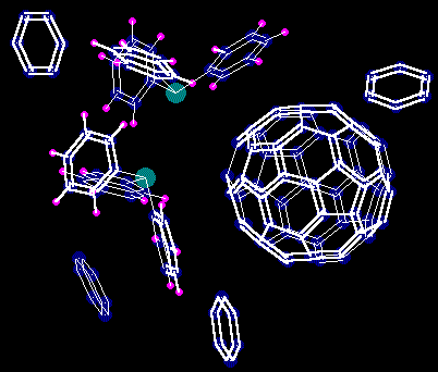 The Bucky ball earned some scientists the Nobel Prize a few years ago. A new allotrope of carbon, its symmetry made its x-ray crystallography difficult. Now, their derivatives can be characterized by x-ray crystallography. This molecule is a complex with bis(triphenylphosphine)rhodium, but the metal atom is not shown. Notice the benzenes "of crystallization" in the unit cell. Unfortunately, derivatization destroys some of the pi-bonds in the original structure and the symmetry is lost. Are the buckys really "aromatic"?