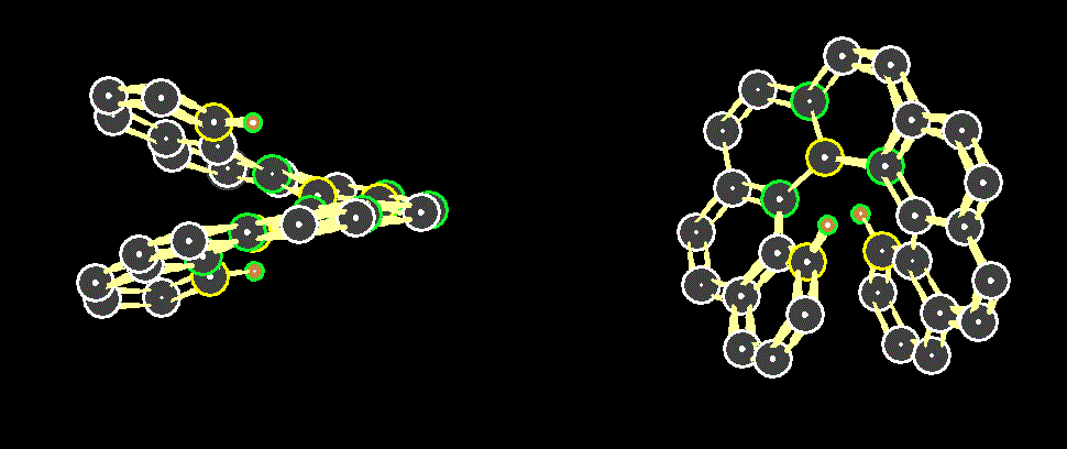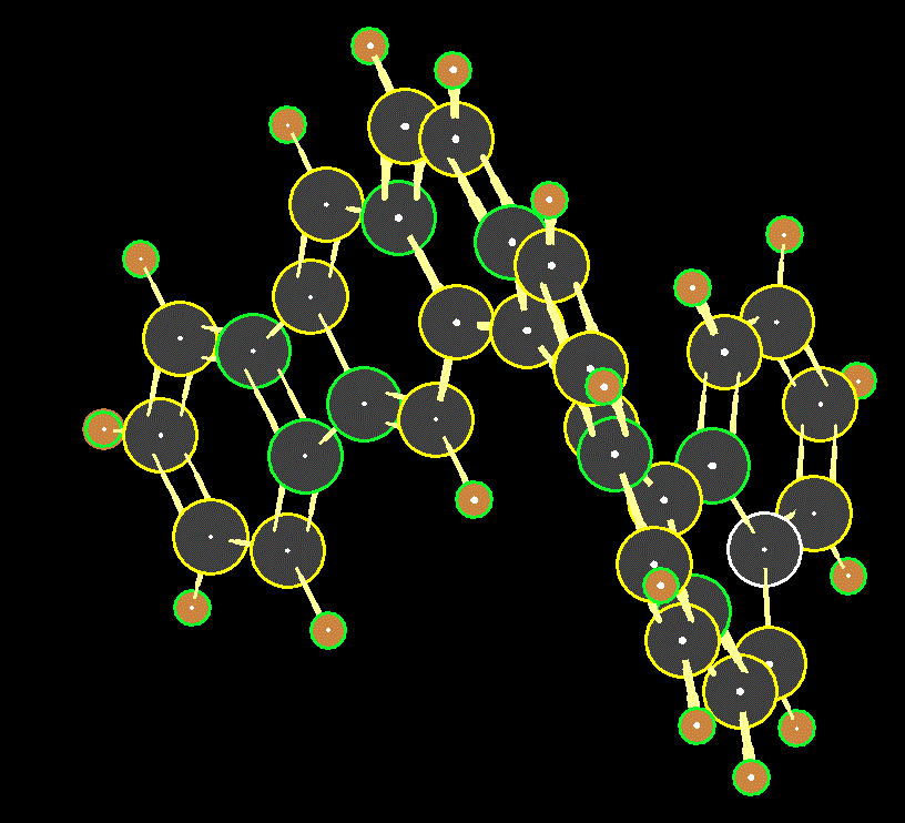 This helicene shows quite clearly the extreme distortion that steric effects can cause in molecules. These distortions can cause quite dramatic changes in chemical reactivity, and is some physical properties, especially the spectroscopic properties, of the molecule. Two molecules in this unit cell are shown.